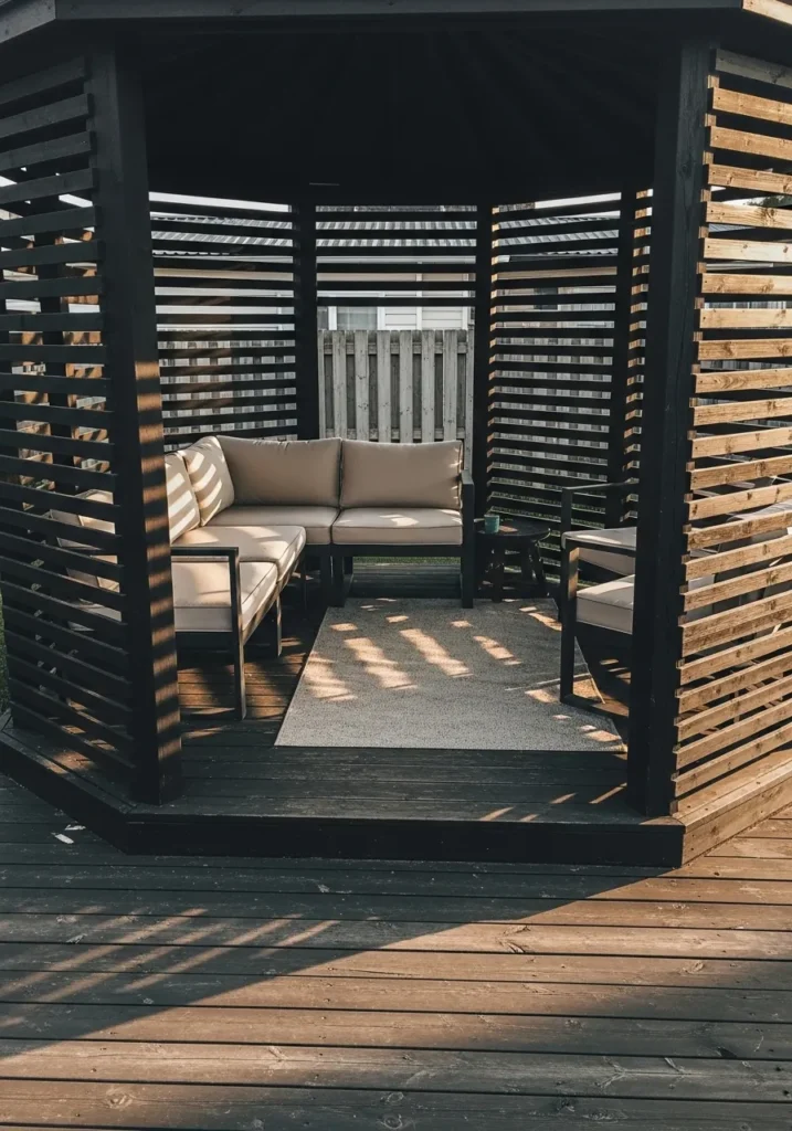 I love how this style feels like a private retreat without feeling heavy or closed in. The slatted design makes it feel contemporary and chic, but the cozy seating keeps it inviting. It is the kind of space where I would happily unwind after a long day and just enjoy a quiet moment outside.