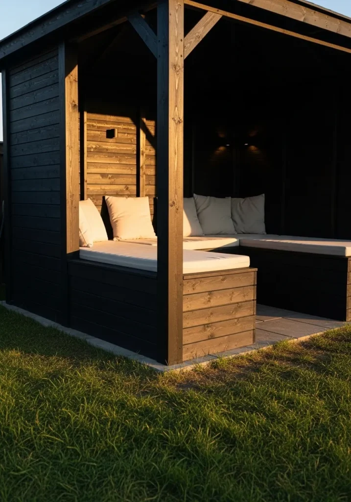 This gazebo features deep stained timber framing and a partially enclosed layout that makes it feel intimate and secure. Inside, a built in wooden platform holds soft cushions and pillows, turning the space into a daybed style retreat. The dark exterior contrasts beautifully with the greenery around it, making the structure stand out in the yard. The open front keeps it connected to the lawn while the side walls provide shelter and privacy.
