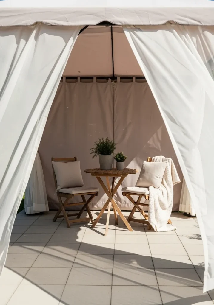 This gazebo uses flowing white fabric panels that wrap around a simple frame, creating a light and airy privacy solution. The curtains are pulled back at the entrance, revealing a small bistro table and wooden folding chairs inside. The neutral color palette keeps everything calm and cohesive. The tiled flooring underneath adds a polished touch while still feeling casual.