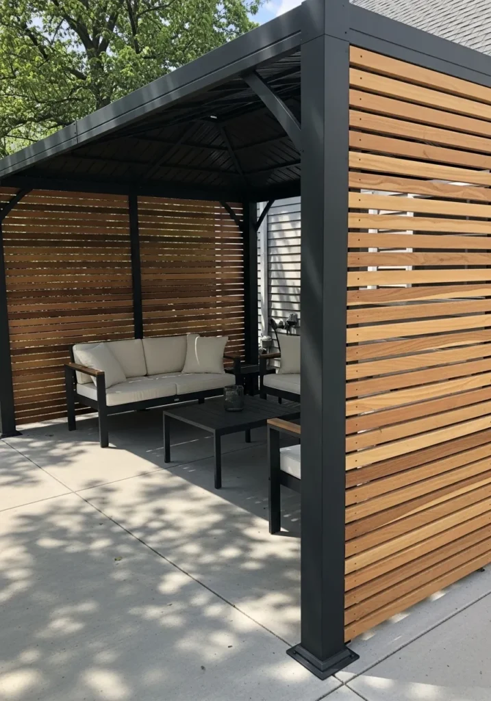 This gazebo pairs a bold black metal frame with warm horizontal wood slats that wrap around the sides for stylish privacy. The contrast between the dark structure and the natural wood panels gives it a clean, modern edge. Inside, a simple outdoor sofa and coffee table create a comfortable lounge zone, while the open front keeps it connected to the patio. The slatted sides allow airflow and filtered light while still shielding the seating area from view.