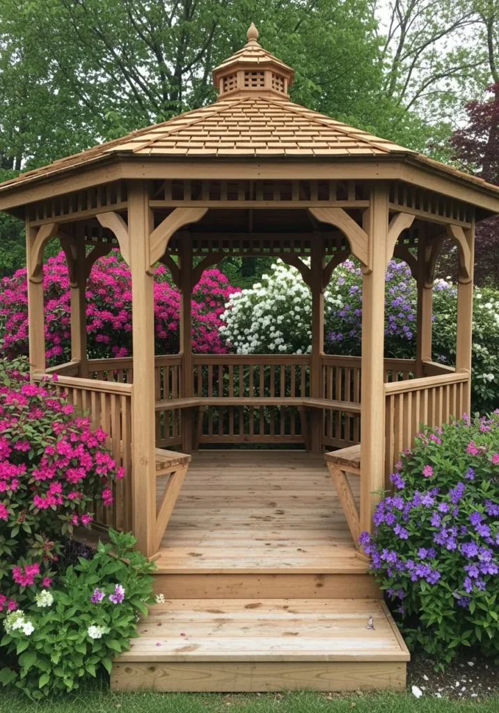 This classic wooden gazebo sits like a little jewel in the middle of a lush garden bursting with pink and purple blooms. The natural wood finish blends beautifully with the greenery, and the open railings provide gentle enclosure without blocking the view. A small staircase leads up into the space, making it feel welcoming and slightly elevated. The tiered roof and decorative trim add timeless charm.