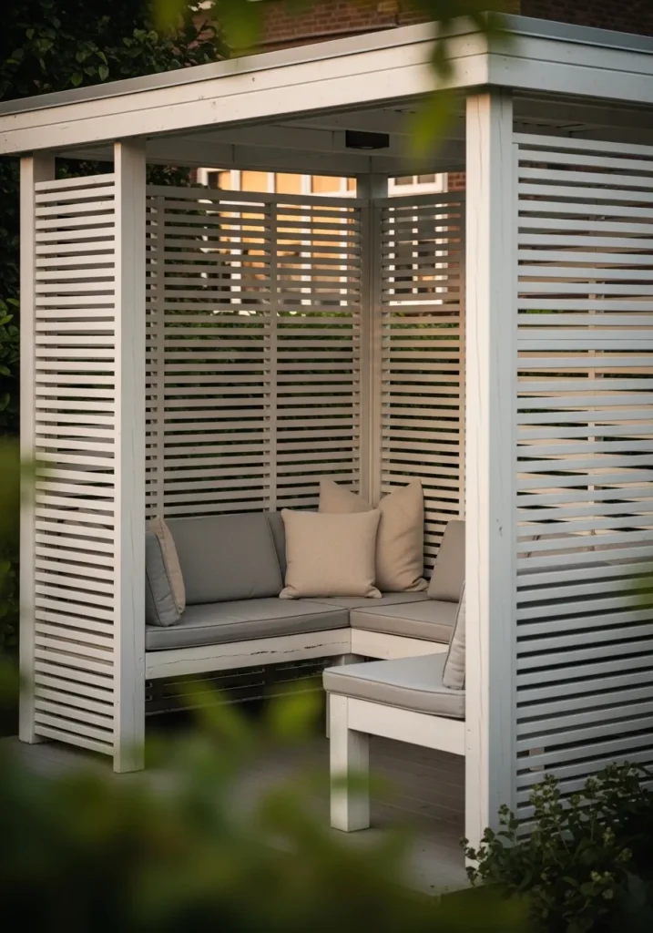 This gazebo features crisp white slatted walls that create privacy while still letting in soft daylight. The clean lines and bright paint give it a fresh, airy presence in the garden. Inside, a built in bench with plush neutral cushions makes the space feel like an outdoor living room. The slats add texture and rhythm to the design without overwhelming the simplicity.
