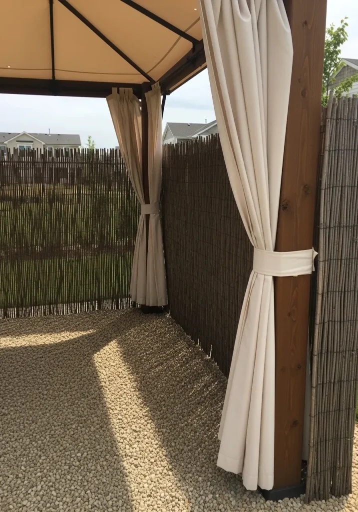 This gazebo uses a simple canopy roof and soft cream curtains to create an easy privacy solution. The fabric panels wrap around sturdy wooden posts and can be tied back when you want an open feel. A natural reed fence along the side adds an extra layer of seclusion while keeping the look relaxed and organic. The gravel base gives it a casual outdoor vibe.