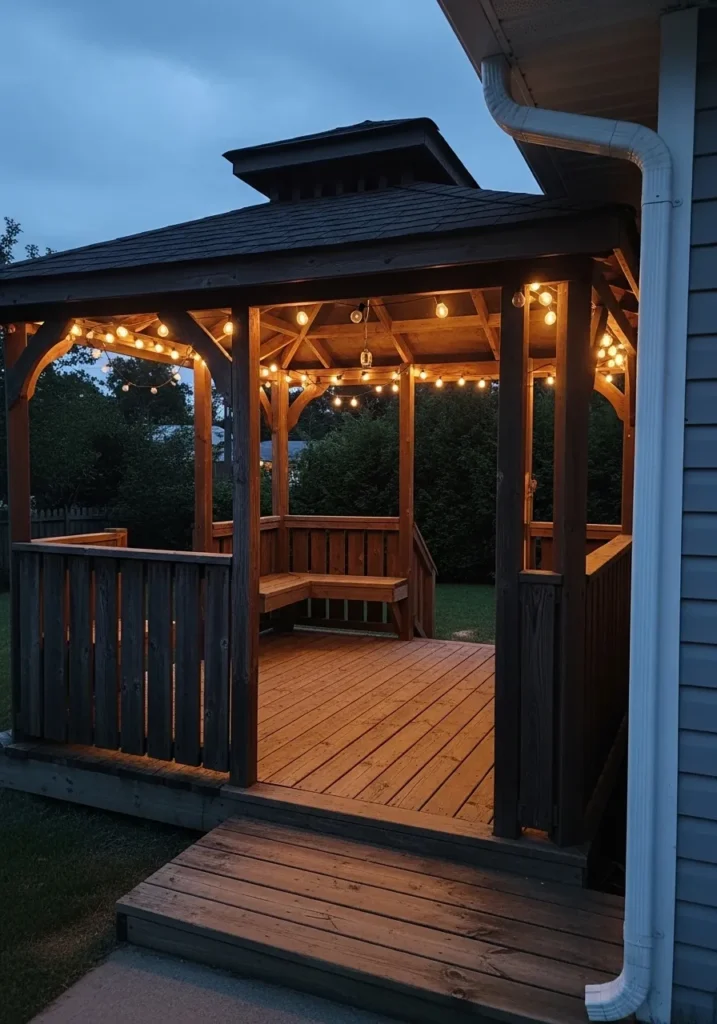 This gazebo features rich dark wood framing and a partially enclosed design that feels cozy and intimate. Soft string lights are woven along the beams, casting a warm glow across the wooden deck. The railing provides gentle separation from the yard while still keeping the space open. The deep tones of the wood create a dramatic contrast against the evening sky.