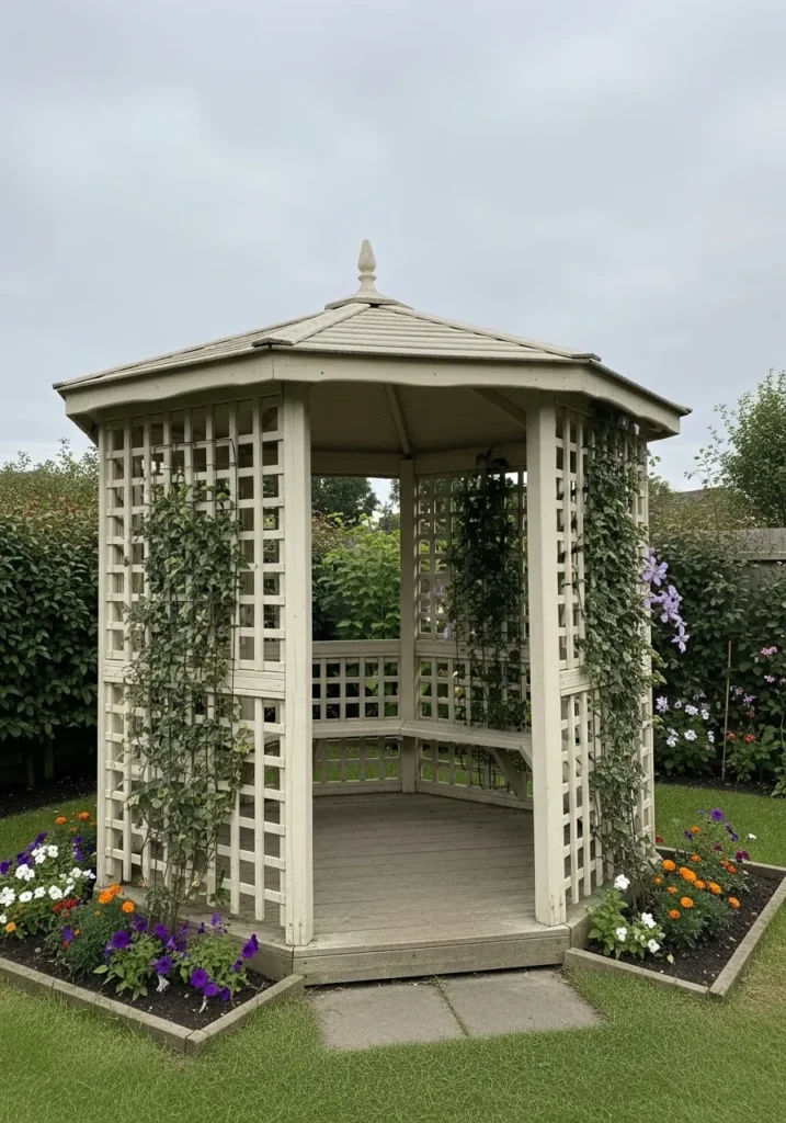 This charming white gazebo is wrapped in traditional lattice panels that offer privacy while still keeping the space open and airy. Climbing greenery weaves through the lattice, softening the structure and blending it beautifully into the garden. The curved interior bench and clean lines of the roof give it a timeless elegance. Surrounded by blooming flowers and manicured grass, it feels like a romantic garden centerpiece.