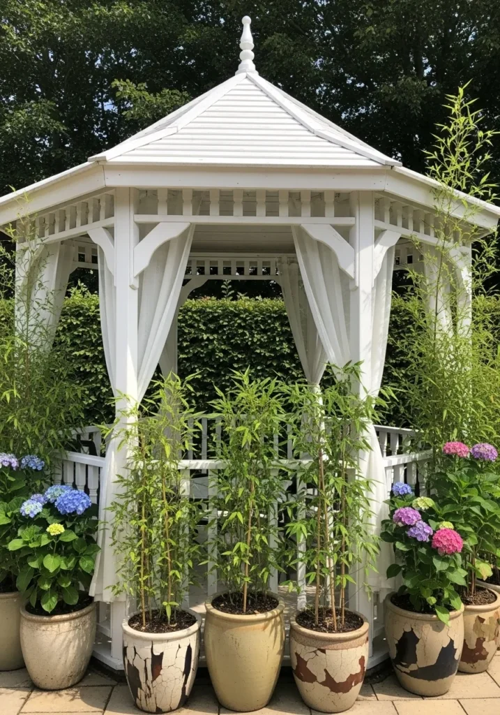 White Garden Gazebo Framed by Potted Plants