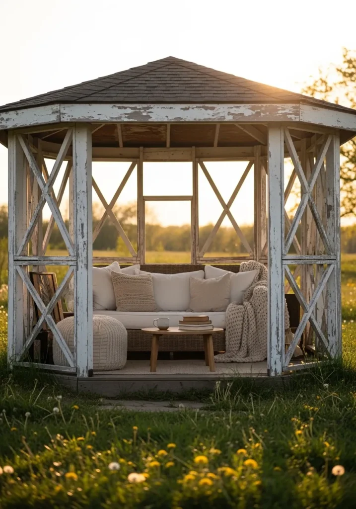 I am completely drawn to the relaxed countryside vibe of this one. The cross beams feel charming and a little nostalgic. It is the kind of gazebo that makes me want to slow down and enjoy golden hour with a warm blanket and a cup of tea.