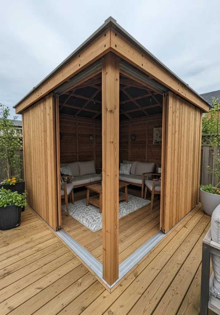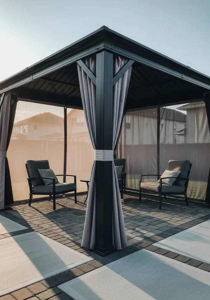 I am such a fan of this minimalist approach. The frosted glass feels stylish and a little unexpected for a gazebo. It offers privacy in a very refined way without feeling heavy or closed in. This would be perfect for a modern backyard where clean lines really shine.
