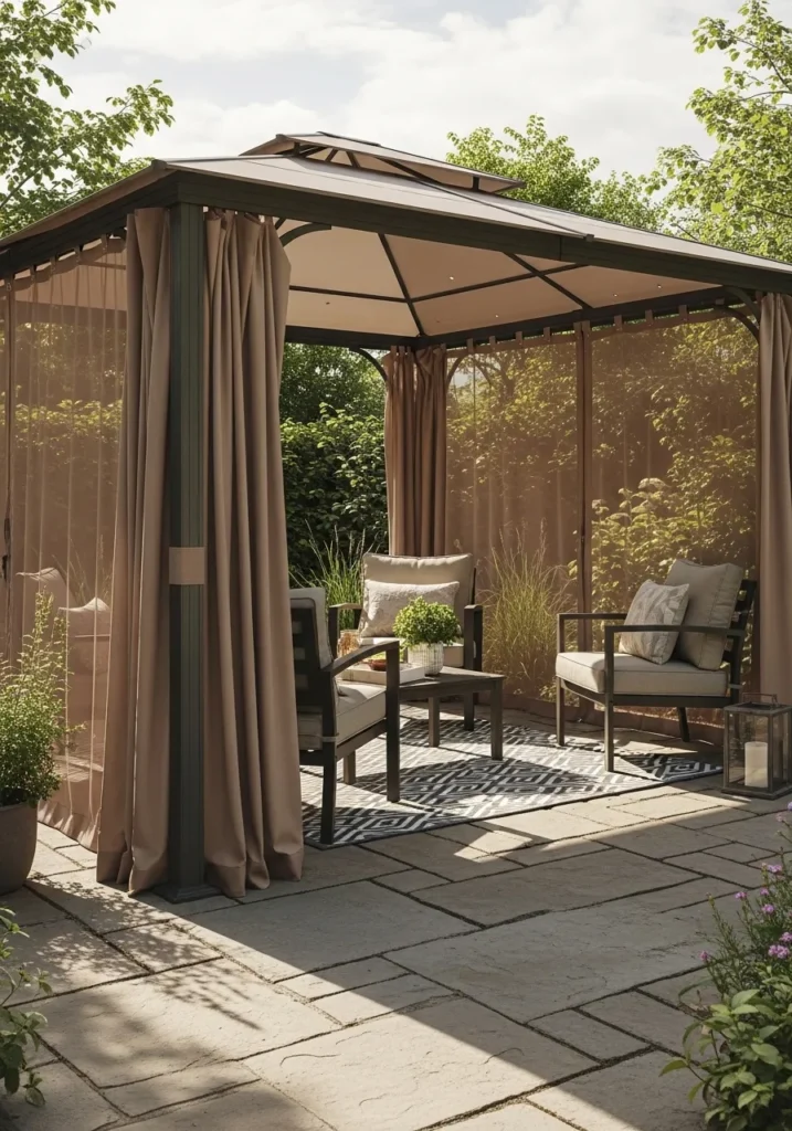 I really love how practical yet stylish this idea is. The woven blinds give just enough privacy while still keeping the space bright. It feels intimate and protected without being heavy. This is exactly the kind of gazebo I would use for relaxed weekend lounging or catching up with friends in a quiet corner of the garden.