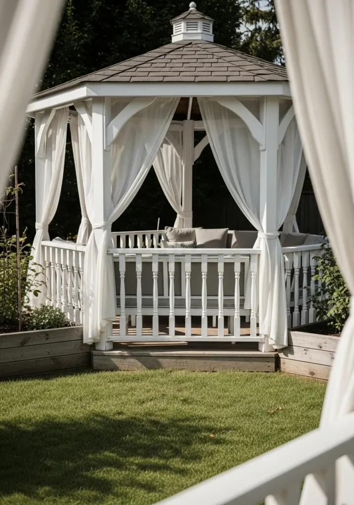 This beautiful white gazebo features classic railings, a shingled roof, and graceful architectural brackets that add timeless charm. Soft sheer curtains are draped between each post and gently tied back, creating adjustable privacy while still allowing light and air to move freely through the space. Inside, a cushioned bench with neutral throw pillows makes the gazebo feel like a cozy outdoor lounge. The raised wooden base and surrounding planter beds frame it perfectly against the green lawn.