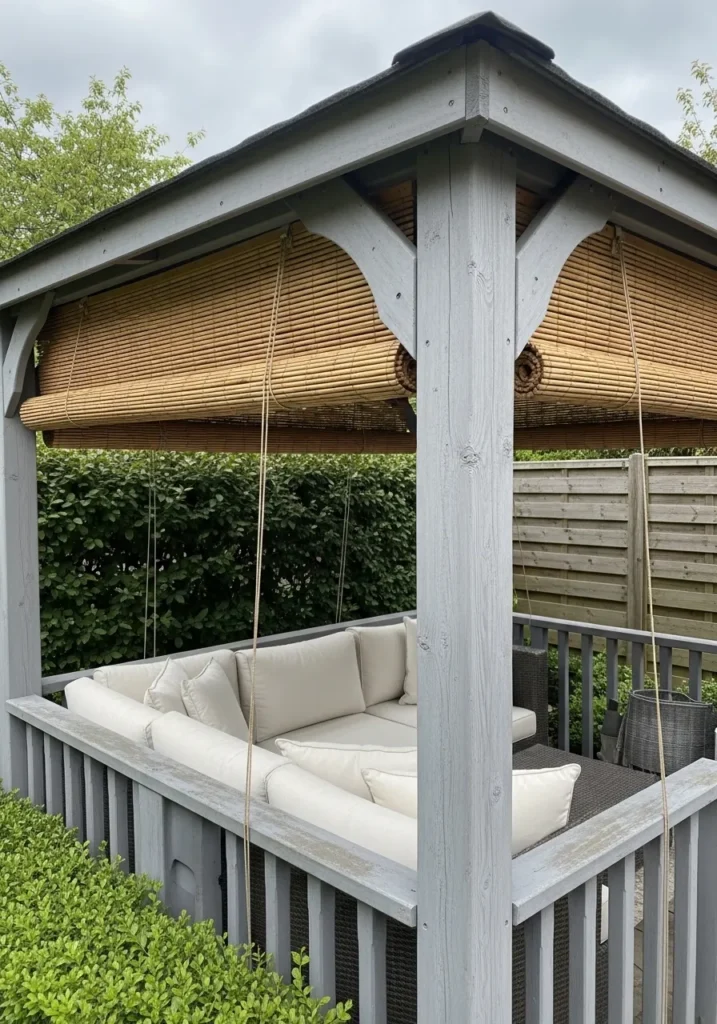 This gazebo has a warm, welcoming look with its soft gray painted posts and woven roll down blinds that add privacy and texture. The blinds filter sunlight gently, creating a comfortable shaded seating area. A built in bench with thick cushions makes the space feel like an outdoor living room. The design blends nicely with surrounding hedges and greenery for a natural, tucked away feel.