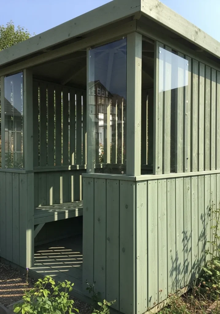 This gazebo features a soft sage green exterior with vertical slatted panels that create subtle privacy while still allowing light to pass through. One side includes large glass windows, which make the structure feel more like a garden room than a simple shelter. The clean lines and muted color give it a calm, Scandinavian inspired look. Surrounded by plants and natural landscaping, it blends beautifully into the yard without feeling bulky.