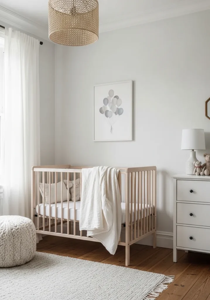 This darling nursery is a total masterclass in how to use soft neutrals to create a peaceful and stylish space for a little one. The walls are bathed in a gentle greige that feels incredibly airy and light, especially with that soft glow coming through the sheer white curtains. A natural wood crib takes center stage, paired with a white dresser and a textured cream pouf that adds such a cozy touch to the room. The woven pendant light and a simple balloon art print keep the vibe whimsical yet totally sophisticated for a modern home.