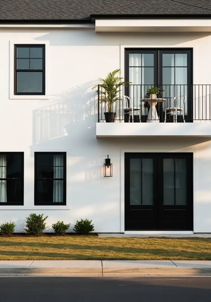 This exterior design is the definition of “crisp meets cool” with its flawless white facade and bold black accents. The clean lines of the architecture are highlighted by the stark black window frames and matching double doors, giving the whole home a very expensive, high-contrast look. A sleek balcony with a thin metal railing provides a perfect little perch for that bistro set, while the small green shrubs along the foundation add just the right amount of organic life against the smooth walls. The way the shadows of the palm plants dance across the white surface adds a dynamic, artistic touch that feels like a modern gallery.