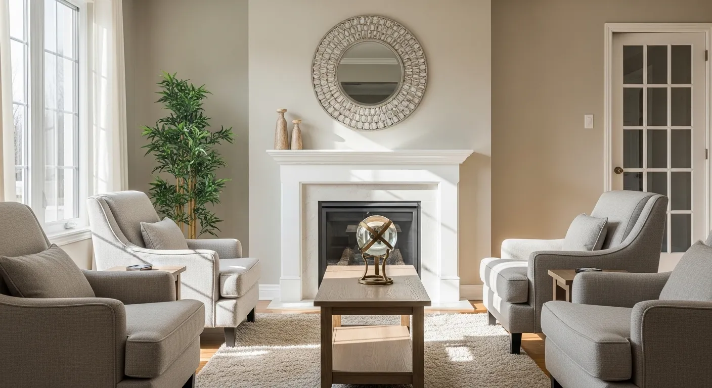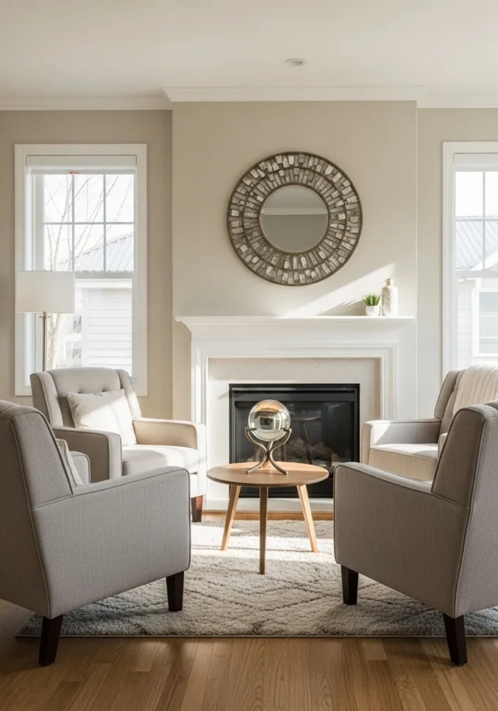 This inviting sitting area is a total dream for anyone who loves a symmetrical and grounded layout. The walls are coated in a versatile, warm neutral that bridges the gap between beige and gray, creating a backdrop that feels incredibly high-end yet approachable. Four plush, upholstered armchairs are arranged perfectly around a petite round wooden coffee table, all centered in front of a classic white fireplace mantle. The large windows on either side flood the room with natural light, highlighting the beautiful texture of the area rug and that stunning sunburst mirror above the fireplace.
