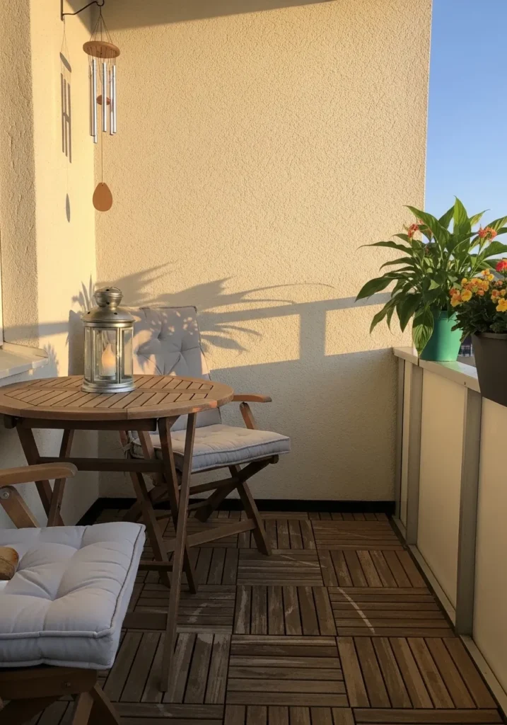This adorable balcony setup is the ultimate inspiration for turning a small outdoor space into a private sanctuary. The walls are finished in a soft, buttery off-white that catches the late afternoon sun beautifully, creating those long, dramatic shadows from the nearby plants. A classic wooden folding table and matching chairs with plush gray cushions make for a perfect morning coffee spot, while the interlocking wood deck tiles add a high-end, finished feel to the floor. Little touches like the silver lantern and the wind chime hanging above give the whole area such a peaceful, intentional vibe.