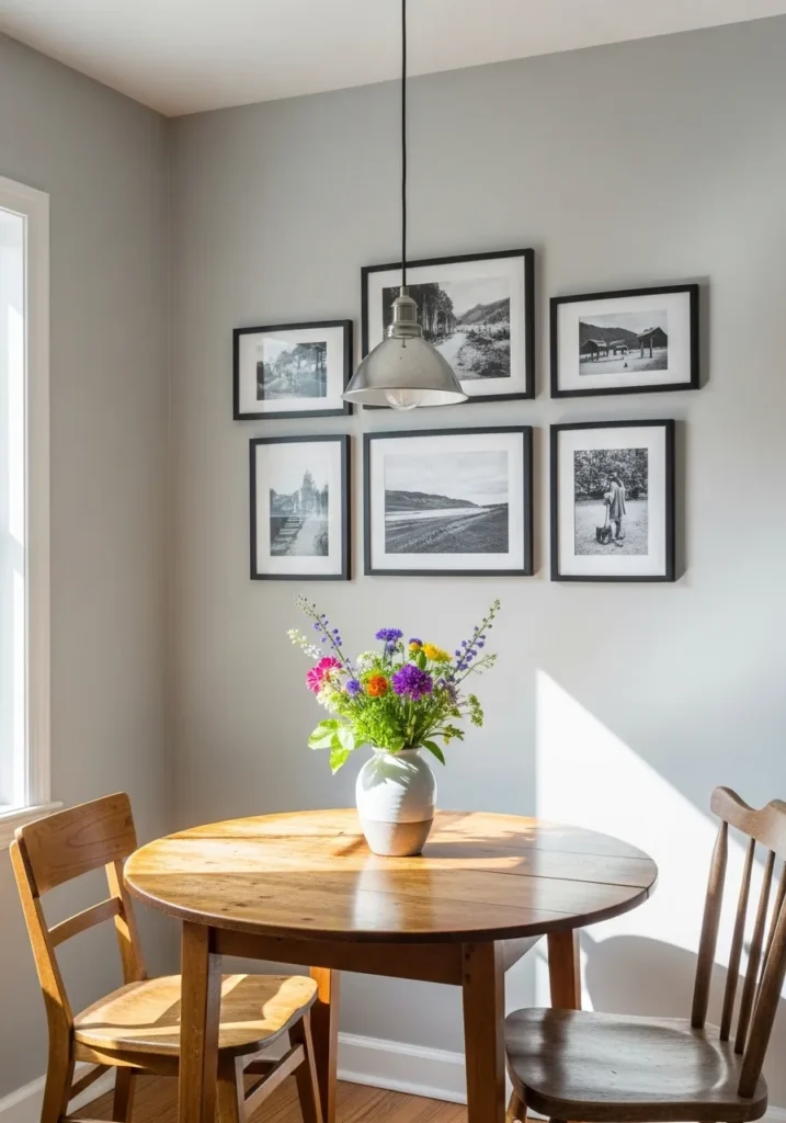 This darling dining nook is a perfect example of how a cool-toned gray can make a small space feel intentional and curated. The light gray walls serve as a smooth, sophisticated backdrop for a gallery wall of black-framed landscape photography, which adds a wonderful sense of depth to the room. A round wooden table sits bathed in a sharp triangle of sunlight, topped with a cheerful bouquet of wildflowers that brings a burst of purple, orange, and yellow to the neutral palette. The simple industrial pendant light hanging above ties the modern aesthetic together while keeping the focus on those beautiful organic textures of the wood and flora.