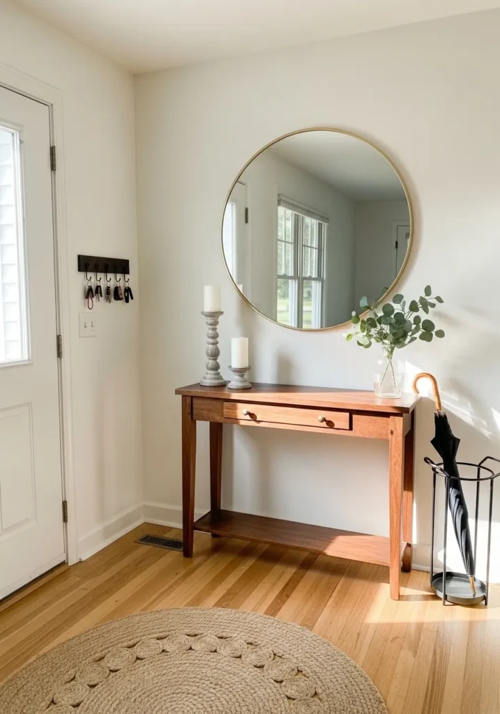 This entryway is a total lesson in how to do “simple and chic” the right way. The walls are coated in a stunningly warm off-white that makes the whole space feel like it’s being hugged by sunshine. A slim wooden console table with a dainty drawer holds a glass vase of fresh eucalyptus and two chunky white candlesticks, creating such a curated first impression. The large round mirror with its thin gold frame is the ultimate designer trick to bounce light around, while that cute circular jute rug on the hardwood floor adds all the right organic textures to ground the look.