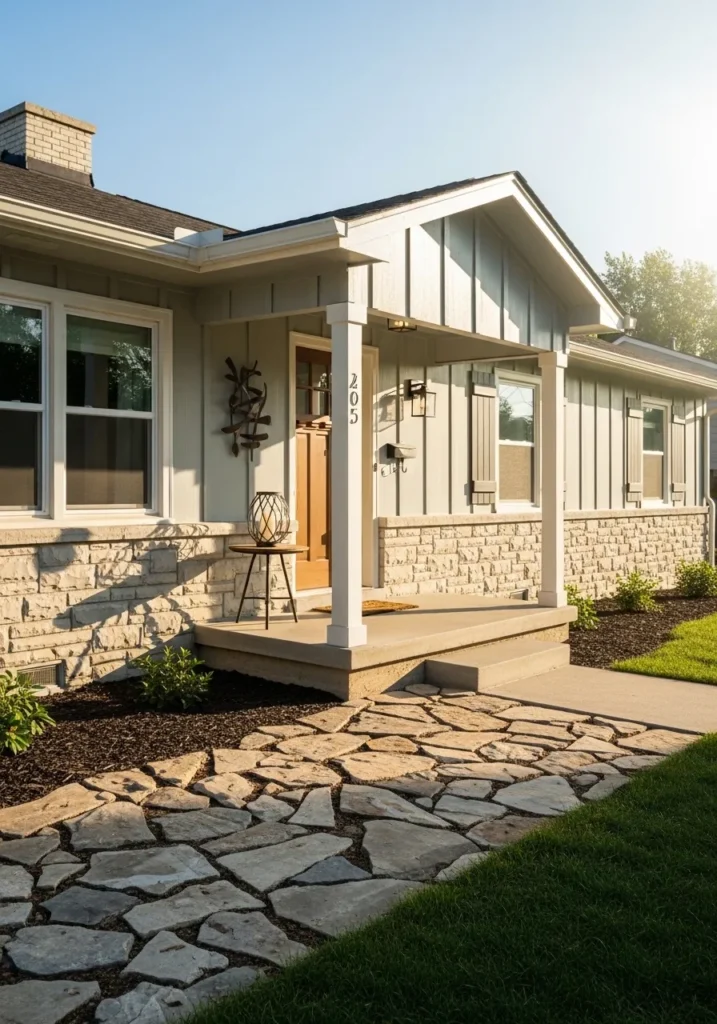 This exterior design combines rustic textures with a modern silhouette to create a home that feels both sturdy and incredibly stylish. The vertical board and batten siding is painted in a muted, breezy neutral that shifts beautifully in the light, especially against the rough-hewn stone foundation. A natural wood front door serves as a warm focal point, while the crisp white porch columns and window trim keep the look bright and polished. The flagstone walkway adds a wonderful organic flow that leads you right onto the cozy covered porch, complete with a unique metal wall sculpture and a decorative lantern.