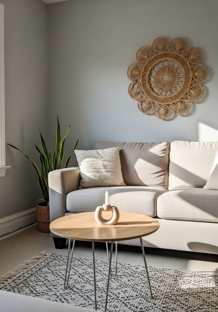 This cozy corner truly embodies the essence of modern boho charm with its lovely balance of neutral tones and natural textures. The light, cool gray paint provides a perfect, serene backdrop, allowing the natural light pouring in to softly illuminate the space. A super comfy-looking beige sofa is dressed up with textured pillows, and that amazing circular woven rattan wall art is just the coolest focal point ever! A cute snake plant in a textured basket, a stylish round light wood coffee table with hairpin legs, and a chic patterned rug add all the right vibes to complete this sweet, relaxed look.