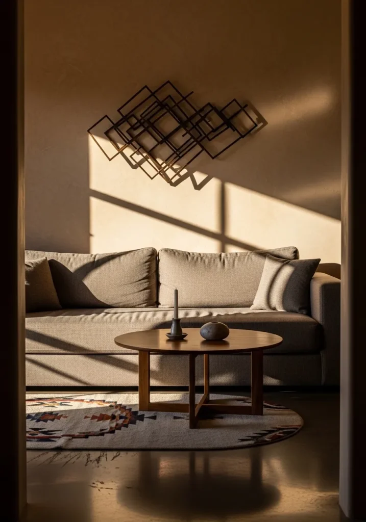 This living room setup is all about that moody, high-end designer feel that still manages to be super inviting. The walls are dressed in a rich, warm beige that looks absolutely stunning when the low afternoon sun hits it, creating these dramatic shadows that make the space feel like a piece of art. A deep taupe sofa sits as the perfect anchor, paired with a sleek round wooden coffee table that keeps things feeling modern and organic. The geometric wire wall sculpture is a total showstopper, and that Southwestern-style rug adds just enough pattern and personality to the floor to pull everything together.