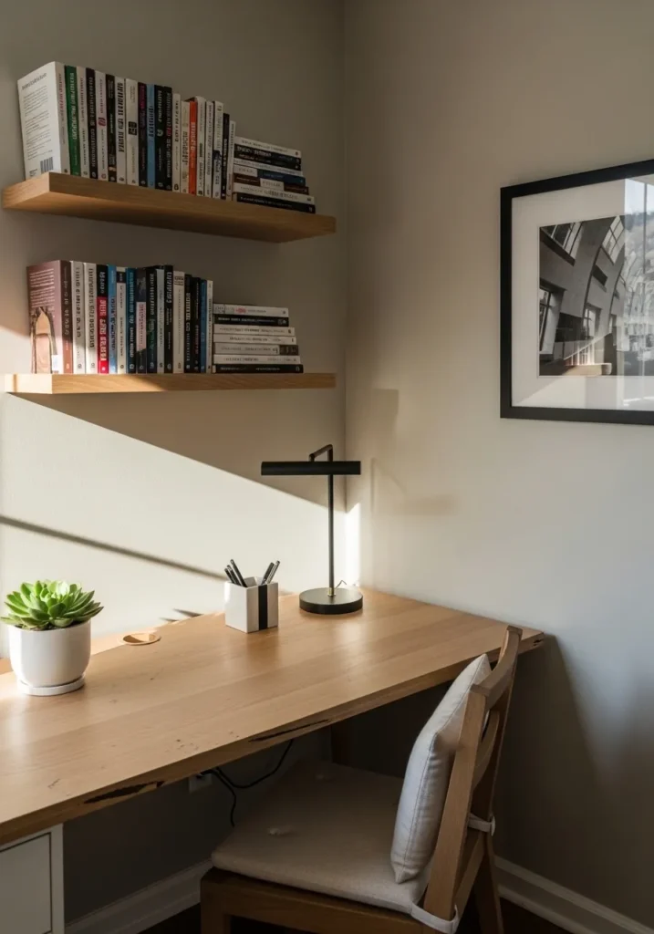 I’m particularly fond of how the sharp angle of sunlight cuts across the desk, highlighting the beautiful grain of the wood and the vibrant green of the small succulent. It’s a great example of how a slightly moodier neutral can make a small workspace feel grounded and substantial without making it feel cramped. The combination of warm wood, crisp black accents, and that perfectly balanced wall color creates a high-end look that is both calming and energizing—perfect for getting into the “flow” state.