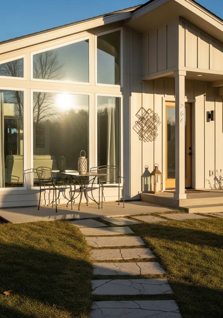 This home exterior features a delightful mix of horizontal siding and clean white trim that frames the windows beautifully. The warm neutral tone of the walls plays perfectly with the natural sunlight to create a welcoming and cozy vibe. A cute wooden bench and a large metal wall clock on the porch add a touch of farmhouse charm, while the dark window frames provide a sharp modern contrast. It looks like the kind of place where you could spend a peaceful afternoon sipping lemonade and watching the world go by.