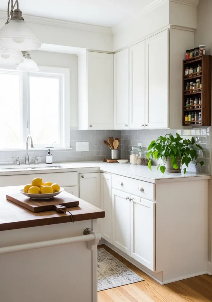 This bright and airy kitchen is the perfect example of how a clean white palette can feel warm rather than clinical. The crisp white cabinetry stretches up to the ceiling, maximizing the sense of height and providing a seamless look against the matching crown molding. A soft gray subway tile backsplash adds a gentle layer of texture, while the warm wood of the butcher block island and hardwood floors brings in that essential organic element. Small details like the wall-mounted wooden spice rack and the pop of green from a healthy potted plant make the space feel truly lived-in and functional.