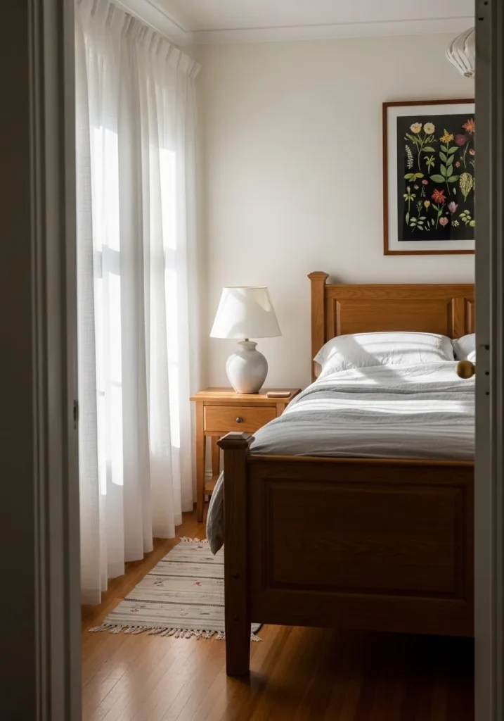 This serene bedroom setup is basically a masterclass in using soft neutrals to create a peaceful sanctuary. The walls are bathed in a creamy, off-white shade that feels incredibly gentle, especially with that gorgeous morning light filtering through the sheer white curtains. A classic wooden bed frame and matching nightstand ground the room with warmth, while the botanical wall art adds a sophisticated splash of color without breaking the calm vibe. The simple white lamp and textured rug under the bed tie everything together for a look that is totally uncluttered and refreshing.