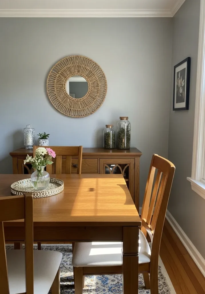 This dining area feels incredibly pulled together and tranquil thanks to the cool gray walls that provide a crisp backdrop for the warm wood furniture. The space features a classic wooden dining table with upholstered chairs and a matching sideboard that adds plenty of storage and style. Above the sideboard, a beautiful round woven mirror creates a stunning focal point, while glass jars filled with greenery and a delicate vase of flowers on a patterned tray bring in those lovely organic touches. A black-framed art piece on the side wall and white crown molding finish the room with a clean and sophisticated touch.