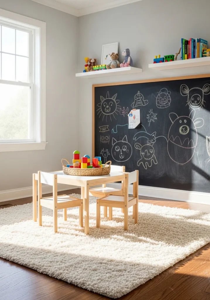 This adorable playroom setup proves that kid-friendly spaces can be totally stylish and organized. The walls are painted in a versatile, soft greige that creates a calm backdrop for all the colorful fun happening in the room. A massive chalkboard wall serves as the ultimate creative outlet for little artists, while white floating shelves above keep favorite toys and books neatly displayed. The center of the room features a pint-sized wooden table and chair set perfectly positioned on a plush, high-pile cream rug that looks so soft for playtime.
