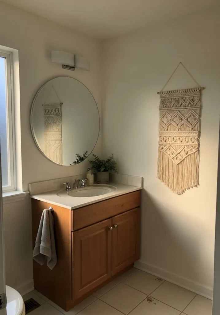 This cozy bathroom nook is a total lesson in how to make a small space feel like a high-end retreat. The walls are coated in a soft and creamy white that manages to feel warm and intentional rather than just plain. A rich wood vanity grounds the corner, topped with a clean white counter and a classic round mirror that reflects all that gorgeous natural light coming from the window. The addition of a large macramé wall hanging adds that perfect touch of boho texture, while a little potted plant keeps things feeling fresh and alive.
