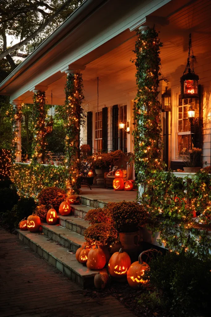This classic porch is covered in lush ivy, with strands of orange lights twinkling through the greenery. Dozens of carved jack-o’-lanterns line the steps, their glowing faces creating a cheerful but slightly spooky welcome. Autumn flowers in warm shades finish the look beautifully.