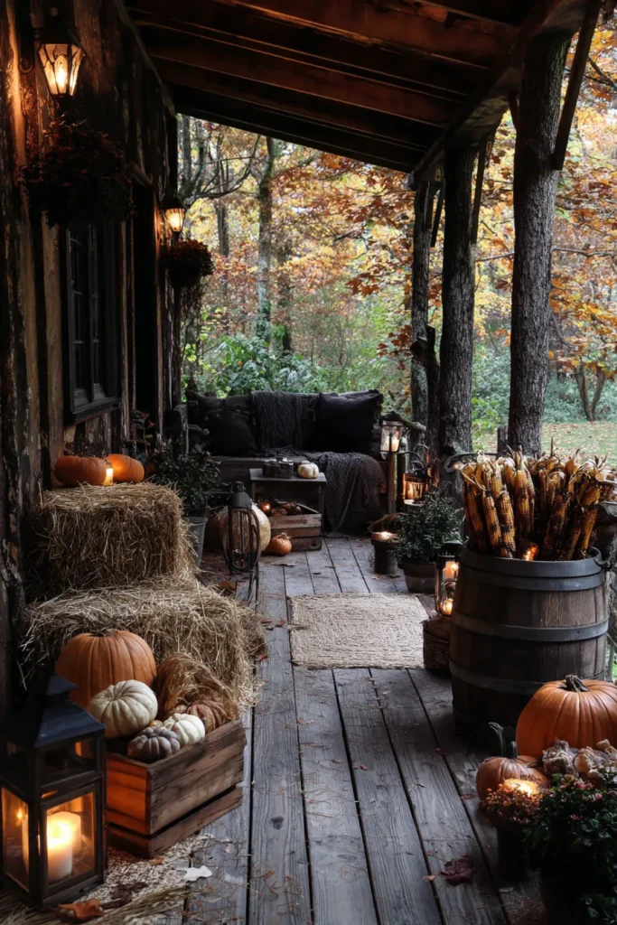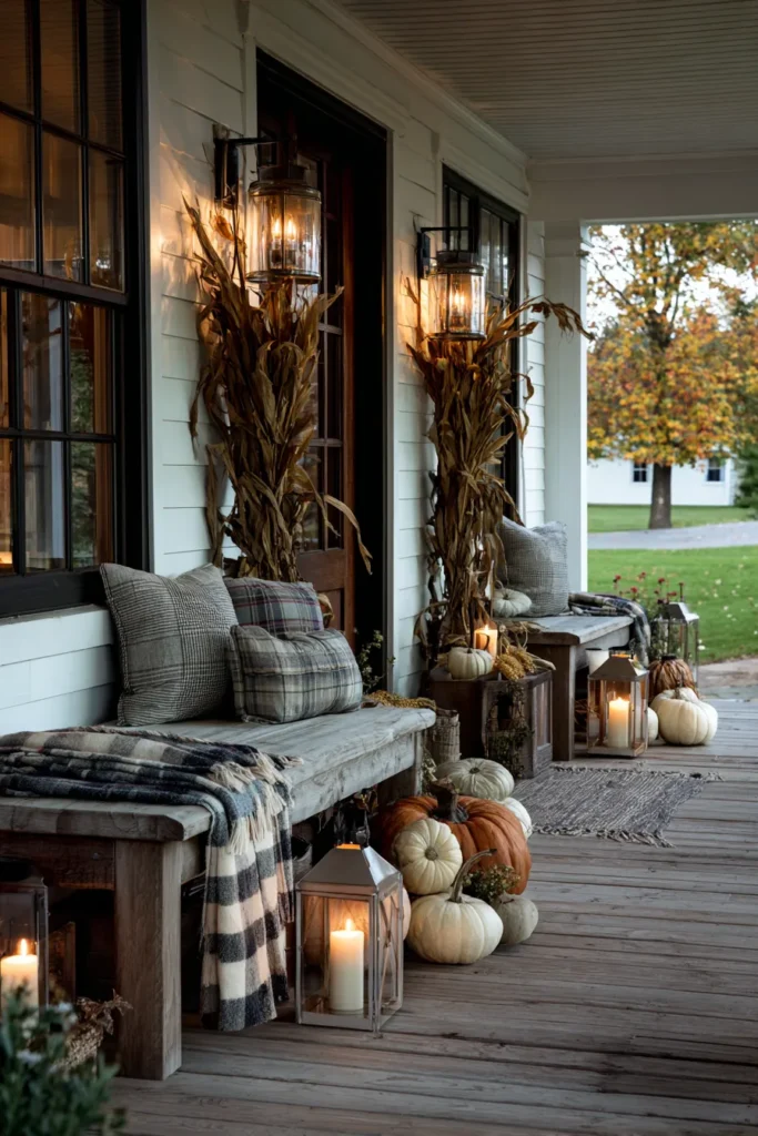 This farmhouse porch keeps things warm with benches covered in plaid pillows and blankets, while pumpkins in muted tones gather at the base of rustic corn stalks. Lanterns glow softly along the floor, and the natural wood details of the porch make everything feel extra inviting. It’s simple, classic, and timeless.