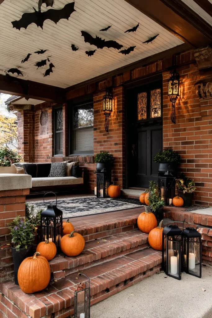 This brick porch keeps things classic with pumpkins lining the steps and lanterns glowing with soft candlelight. The ceiling is decorated with black bats in flight, creating a fun and slightly spooky detail that catches the eye. A patterned rug and cozy seating corner finish off the inviting look.