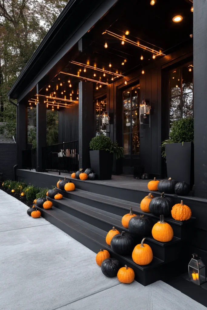 This sleek black porch goes bold with rows of orange and black pumpkins stacked along the steps. Warm string lights glow across the ceiling, making the dark exterior feel vibrant and welcoming. Large black planters frame the doorway, keeping the look modern and stylish.