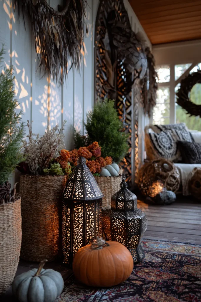 This porch mixes Halloween with boho charm, featuring woven baskets filled with greenery and textured autumn blooms. Oversized lanterns with intricate cutouts cast beautiful shadows, while pumpkins in natural tones complete the cozy setup. A patterned rug ties everything together with a warm and inviting touch.