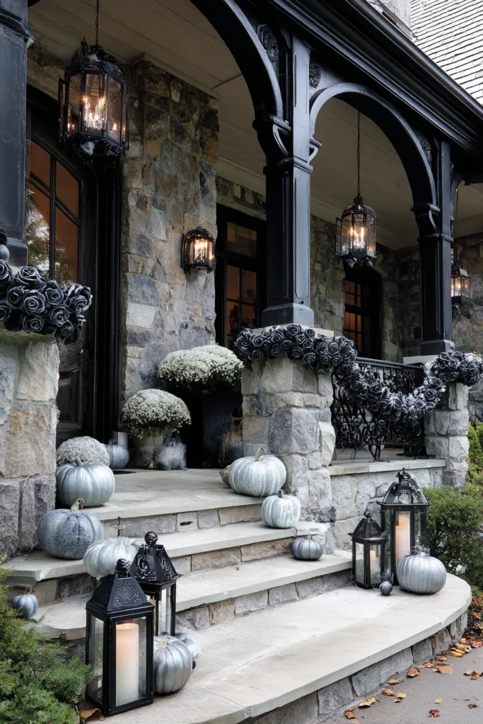 This stone porch feels chic and moody with silver-toned pumpkins scattered along the steps and black lanterns glowing with candlelight. Dark garlands drape across the pillars while lush white florals soften the overall look. The mix of stone, metal, and soft light creates a strikingly elegant Halloween display.