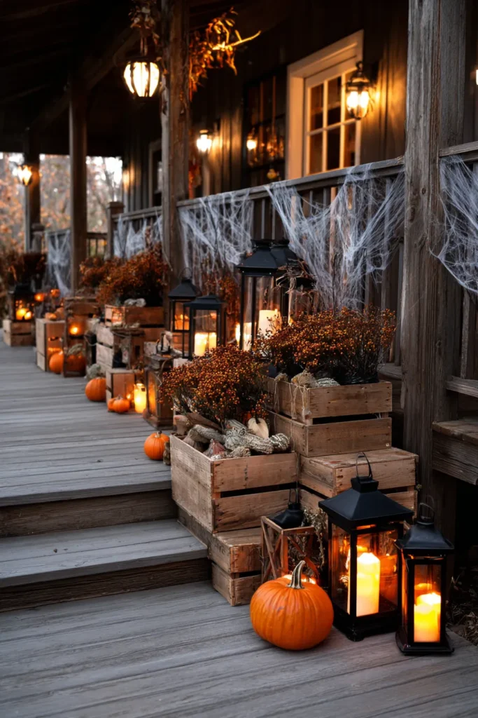 This porch makes a statement with stacks of rustic wooden crates filled with pumpkins, lanterns, and branches dotted with orange berries. Fake cobwebs stretch across the railing, catching the warm glow of the lanterns as they flicker. The overall effect is playful, festive, and full of Halloween charm.
