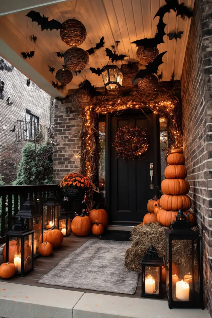 What I like most about this porch is the way the bats make the ceiling come alive. It’s such a simple idea, yet it instantly transforms the space. Paired with the pumpkins and lanterns, it feels playful and charming without being overdone.