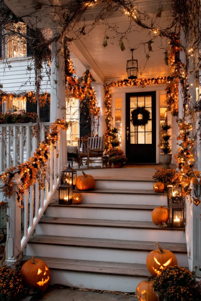 This porch looks straight out of a Halloween fairytale with glowing garlands wrapped around every post and railing. Warm orange lights twinkle through fall leaves, while jack-o’-lanterns and lanterns line the steps, creating the perfect path to the front door. A simple wreath and cozy chairs pull the whole scene together with a welcoming touch.