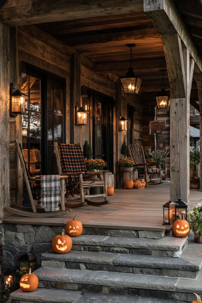 This wooden porch is full of charm with carved jack-o’-lanterns glowing along the steps and plaid blankets draped over rustic rocking chairs. Lanterns hang above the door, casting a warm golden light that makes the whole scene glow. The natural wood and stone details give it a timeless cabin feel.