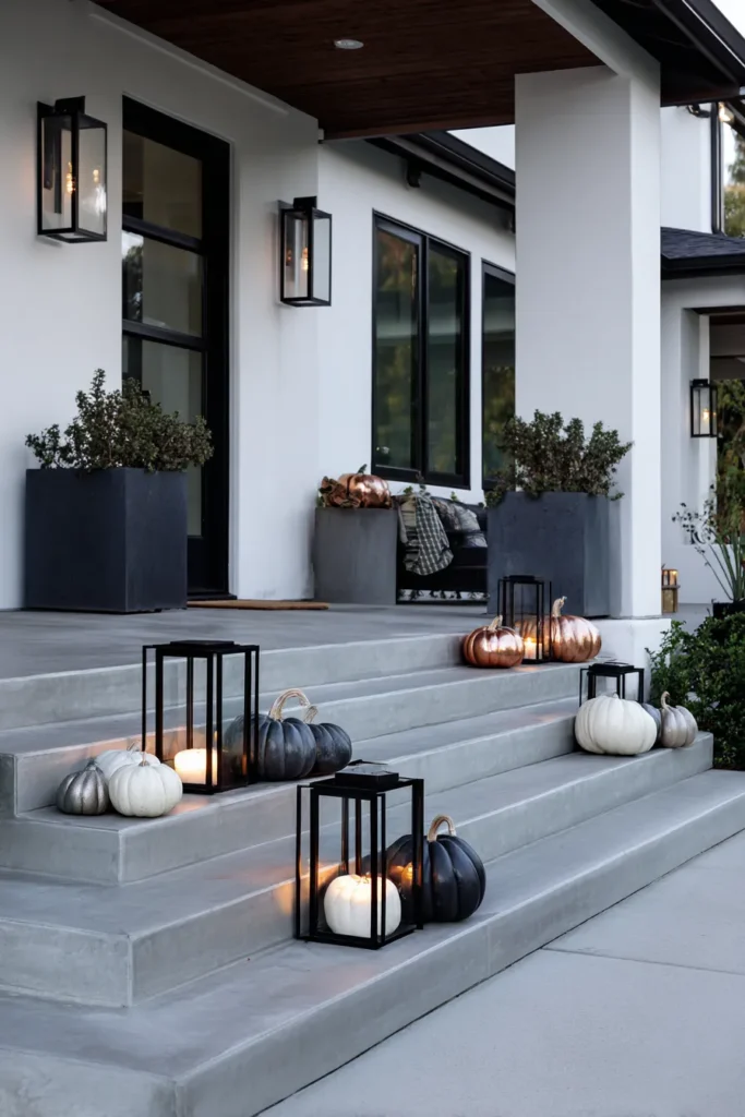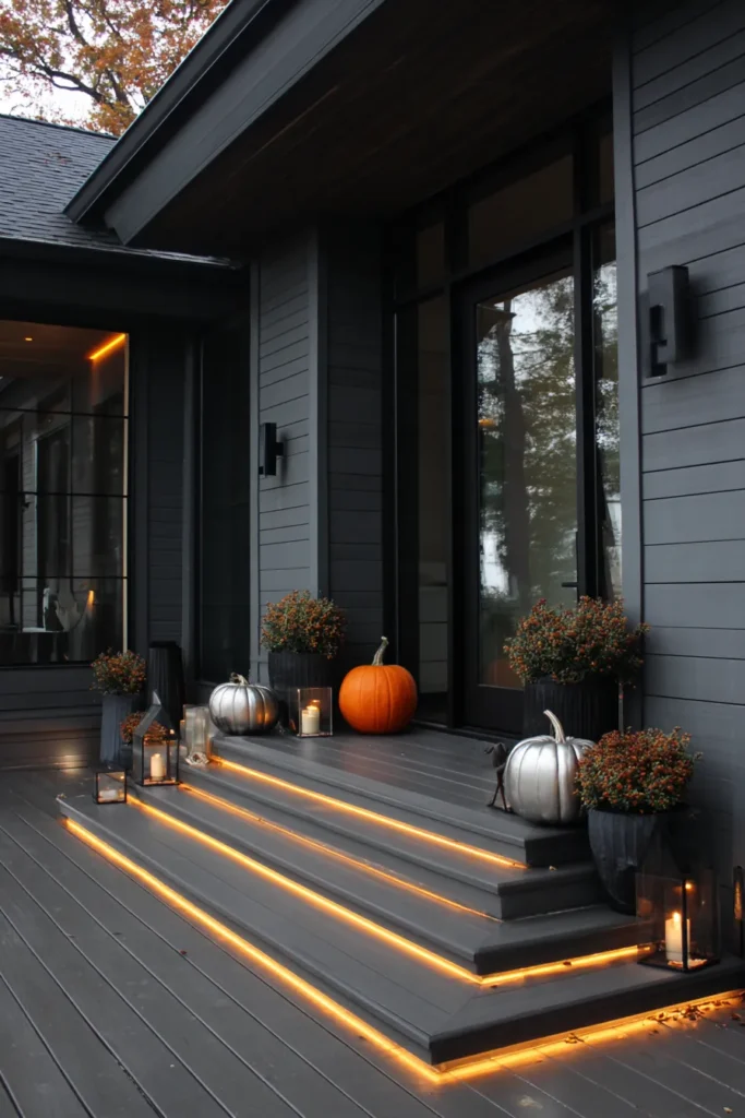 This sleek modern porch stands out with its dark siding and clean architectural lines, made even more dramatic by the glowing orange lights embedded into the steps. Black planters filled with fall greenery frame the doorway while pumpkins in both silver and orange add a festive but polished Halloween touch. Tall lanterns with flickering candles complete the chic design.