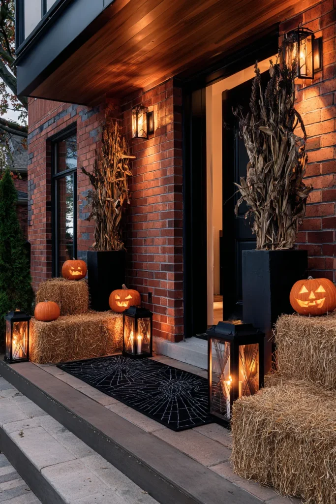 This brick house keeps things simple but impactful with hay bales stacked by the front steps, topped with glowing jack-o’-lanterns. Tall stalks of dried corn frame the entryway, while lanterns filled with flickering candles bring warmth to the scene. The black spiderweb doormat ties it all together with a subtle Halloween detail.
