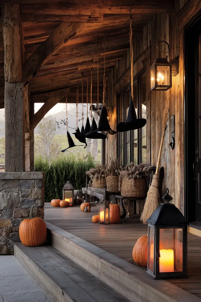 This wooden porch goes for a playful look with a row of witch hats hanging from the ceiling, swaying gently in the breeze. Large lanterns and pumpkins line the steps, while woven baskets filled with dried plants bring in an earthy texture. A broom leaned against the wall adds just the right witchy finishing touch.