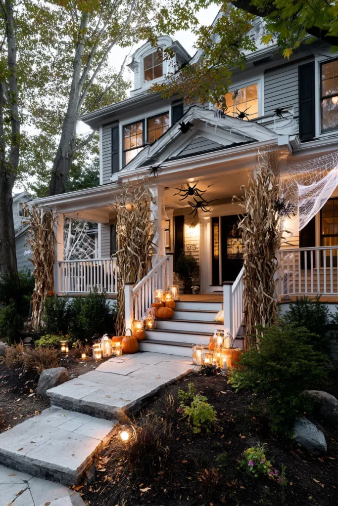 This white farmhouse porch leans into spooky elegance with giant spiders crawling across webs stretched along the railings. Corn stalks frame the stairs, while glowing lanterns and pumpkins line the walkway, casting a warm light as you approach. The whole porch feels alive with both charm and a hint of creepiness.