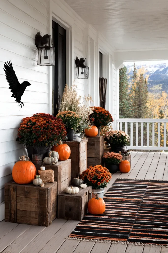 This porch keeps things bright and cheerful with large planters of orange mums, rustic wooden crates, and pumpkins of every size stacked in a casual arrangement. A striped rug adds a pop of pattern, while a simple black crow silhouette on the wall keeps the Halloween theme going. The backdrop of white siding makes all the colors stand out beautifully.