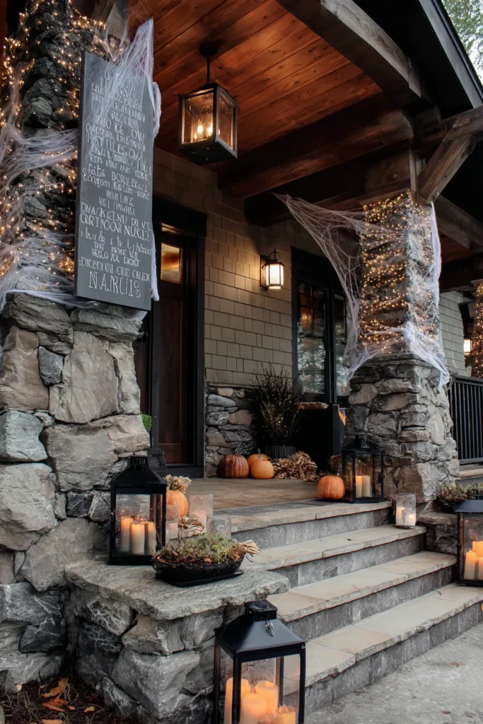 This stone porch is wrapped in glowing string lights covered with spooky spiderwebs, giving it a dramatic yet inviting feel. Large black lanterns filled with candles line the steps, while pumpkins of different sizes sit neatly near the door. The rustic stone pillars and warm wood ceiling make the whole setup feel cozy and grounded.