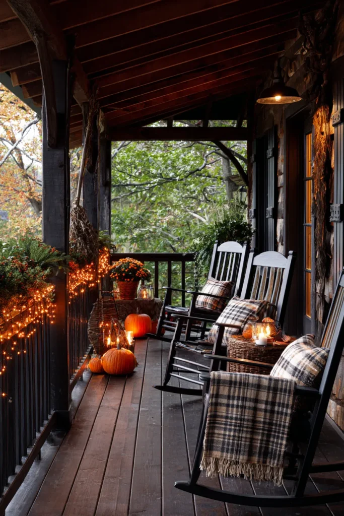This wooden porch feels warm and welcoming with plaid blankets draped over rocking chairs and pumpkins tucked along the railings. Strings of orange lights twinkle beside baskets filled with mums, creating a cozy autumn glow. It’s the kind of porch that invites you to sit down and relax for hours.
