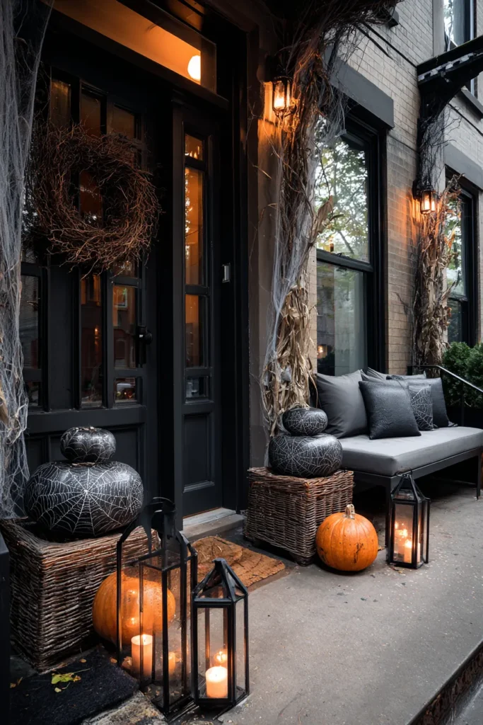 This porch leans into moody style with pumpkins painted in glossy black and etched with spiderweb designs. Tall lanterns filled with candles glow at the steps, while a rustic twig wreath on the door ties the whole look together. Neutral gray seating nearby softens the overall effect, keeping it chic and approachable.